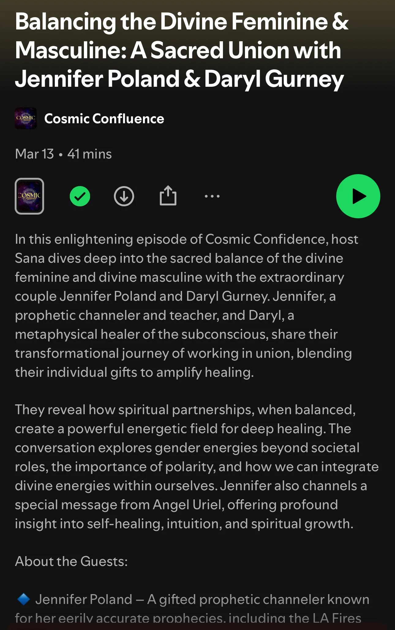 Divine Feminine and Divine Masculine in Harmony - Chakra Way Podcast: A deeply inspiring chat with Jennifer Poland and Daryl Gurney, a couple who combine their talents and gifts to create a remarkable example of how when the Divine Feminine and Divine Masculine work in harmony, extraordinary growth and healing is possible. In this conversation we dive deep into how this polarity supports and nurtures the other, how we can clear past lives, understand and clear our karma and our self-limiting patterns. Daryl is a metaphysical therapist and Jennifer is a prophet who is deeply connected to Spirit. This is a fascinating conversation and one that will nourish deeply.